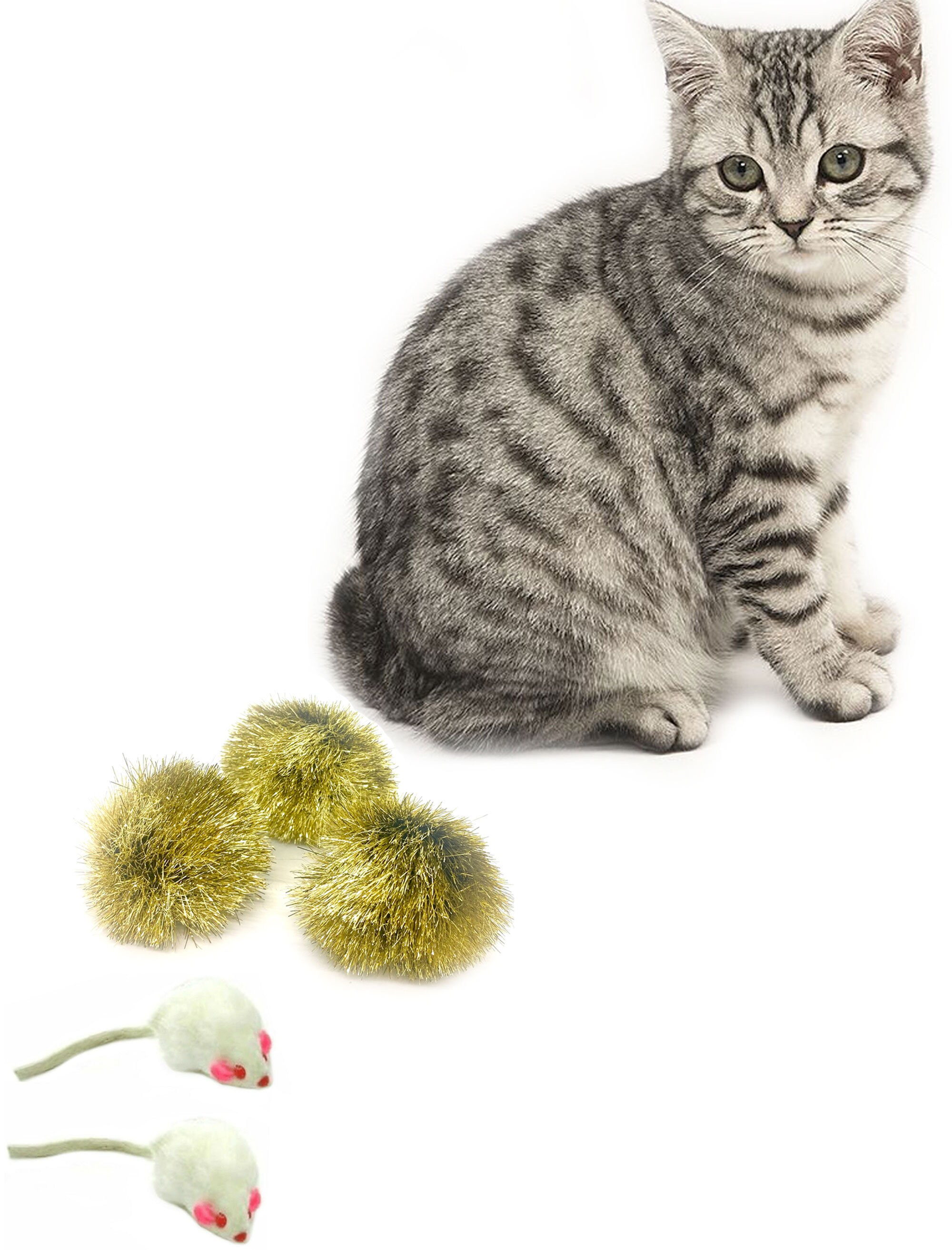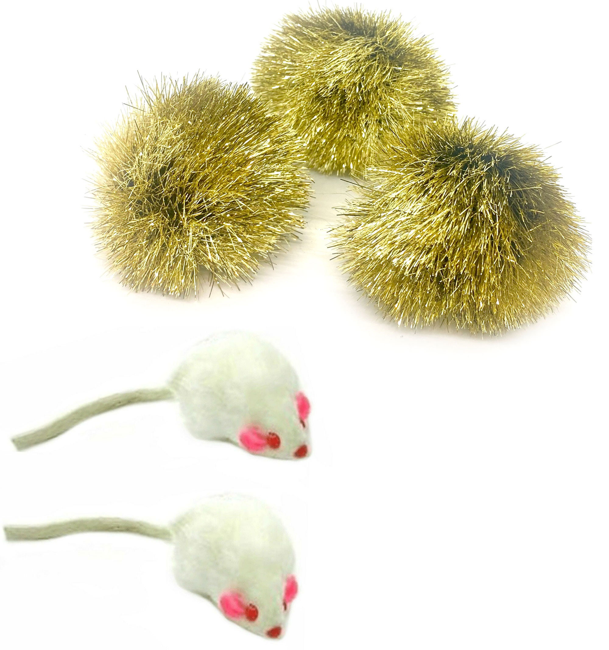 A cat lover's dream package! 2 real fur white rattle mice. Cats enjoy chasing and batting these retro cat toys around the house. 3 JUMBO Gold-colored tinsel pom poms. Cats are attracted to the tinsel and the sound tinsel makes. All of these amazing toys for a reasonable price and cat entertainment.